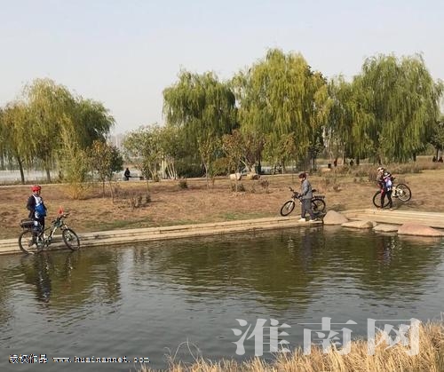 近日,淮河早報、淮南網記者在中央公園內看到,有騎行愛好者在水域邊刷車,因公園內不允許騎車且沒有騎行道,這幾名騎行者就把車扛到水域邊刷洗。(記者)