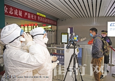 2月3日,在淮南東站,市第三人民醫院護士李幼文,用測溫儀對進出站旅客進行體溫全面監測。連日來,我市組織衛生防疫和醫護人員24小時堅守基層一線防控崗位,全力做好疫情聯防聯控工作,用他們的堅毅與執著,詮釋白衣天使的職責。(記者 倪軍)
