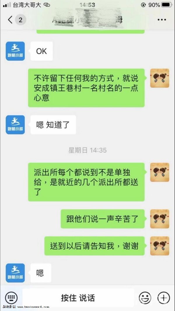 這次新型冠狀病毒感染的肺炎疫情嚴峻,因為特殊情況,臺灣很難出口口罩,對于一直關注著疫情的“黨的女兒”來說,非常焦急。1月31日一早,她想到自己有以前在家時聯系的跑腿小哥微信,她嘗試著和跑腿小哥聯系上,并協商購買口罩,因為這些物資都緊缺,兩人在微信里不停地確定型號、數量等,直到“黨的女兒”把錢轉給跑腿小哥后,她才在微信里聯系了她認識的王巷村里的一位村醫和老龍眼派出所的閃所長。