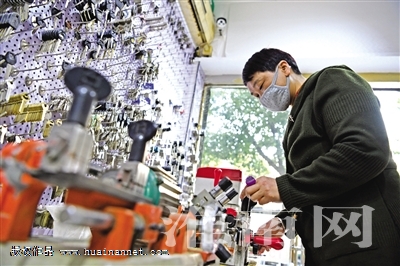 3月19日,安徽淮南市田家庵區鎖業經營戶陳春英在為市民配鑰匙,服務社區群眾生活。生活服務業與百姓日常生活息息相關。隨著疫情防控形勢持續向好,餐飲住宿、美容美發、維修等相關服務行業加速復工,釋放消費熱情。(徐 靖 陳彬 攝影報道)( 《人民日報》3月20日刊發)