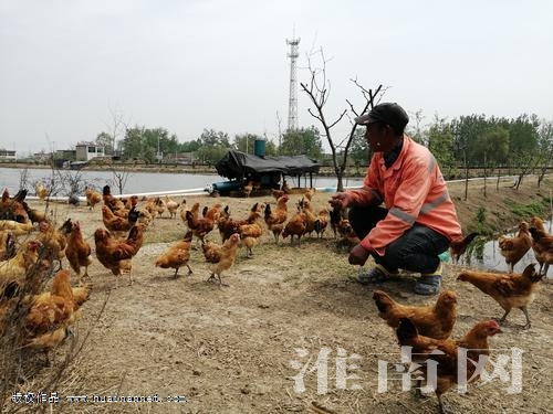 圖為徐圣杰和他在蝦塘飼養(yǎng)的雞。(記者 張明星)