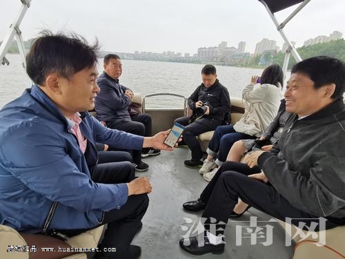 圖:嶺南村泉山湖河長向大店村有關負責人介紹巡查湖面網上打卡工作經驗。