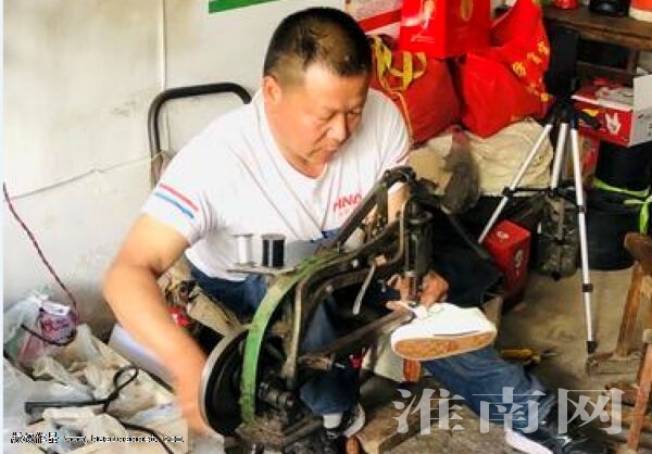 五月的淮南,驕陽似火。5月19日上午,在田家庵區曹庵鎮街道上的一家修鞋、鎖具店里,一陣“嗒嗒嗒、嗒嗒嗒”的縫紉機聲,從店內傳出,雙下肢殘疾的店主楊維山正在這里為一名顧客縫補牛仔褲和鞋子。一名從附近陳巷村而來的顧客,對著采訪人員,連連稱贊楊維山價錢公道、技術精湛。