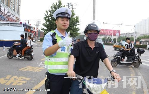 圖為6月17日下午田家庵二大隊輔警向佩戴頭盔的市民伸手點贊。(記者 蘇國義)