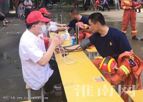 從7月17日開始,毛集實驗區普降大到暴雨。汛情發生后,消防救援局南京訓練總隊的指戰員迅速馳援淮南,承擔起固堤、疏散轉移群眾等任務。在安置點,來自安徽理工大學第一附屬醫院(淮南市第一人民醫院)的醫生為消防指戰員量血壓、檢查身體,保障他們的身體健康。在安置點,還有100多名轉移群眾,醫療衛生志愿者和駐點醫生一起,開展義診,向群眾送醫送藥。