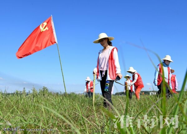 8月3日,淮南市八公山區新莊孜街道女子黨員志愿者服務隊在淮河八公山段巡堤查險。進入三伏高溫天氣,為了補充淮河堤壩巡堤力量,淮南市八公山區從新莊孜街道、畢家崗街道12個社區抽調80名女子黨員志愿者參加淮河堤壩白天巡堤,讓夜間堤壩值守人員輪換休息,確保淮河堤壩退水期安全。(特約攝影 陳 彬)(《安徽日報》8月5日刊發)