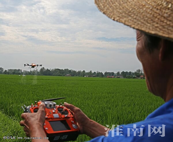 圖四:毛集實驗區焦崗湖鎮種糧大戶使用植保無人機噴灑農藥。