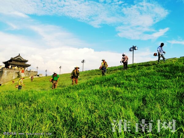 圖三:8月7日,園林工人正在清除壽縣古城墻的雜草。