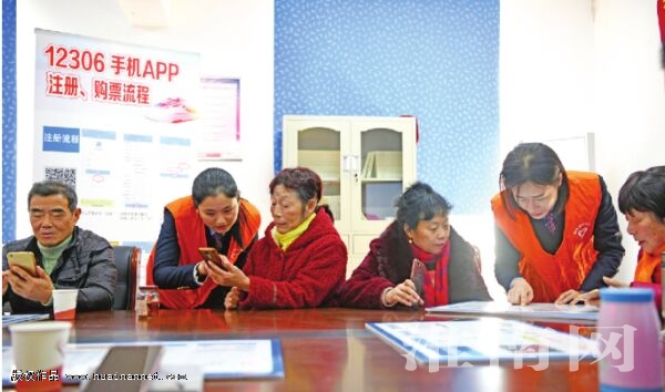 1月14日,淮南市田家庵區龍泉街道泉林社區新時代文明實踐站內,青年志愿者幫助老人使用手機購票。當日,淮南西站組織志愿者走進社區,通過平板電腦、圖板等,向社區老人講解鐵路12306App、電子客票和自動檢票閘機使用等,讓老人了解智能出行。( 特約攝影 陳 彬)(《安徽日報》1月17日一版刊發)