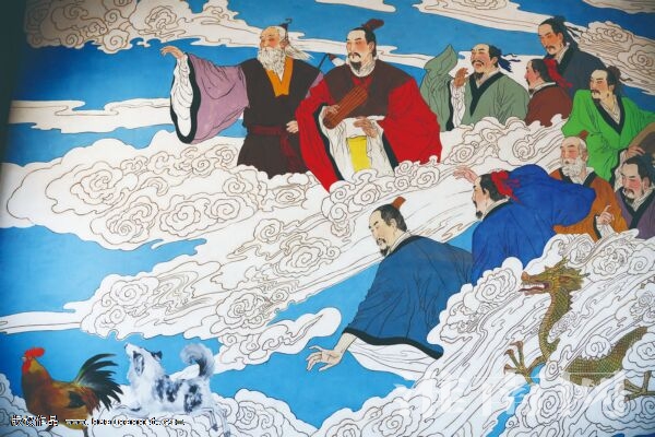 文化為魂,旅游為體。我市通過挖掘“一人得道,雞犬升天”的文化內(nèi)涵,將其“活化”為旅游元素。在淮南八公山旅游景區(qū)的漢淮南王宮內(nèi),有一幅彩繪壁畫《八公山仙境圖》,畫中反映了劉安與八公在山中著書立說、修道煉丹的活動內(nèi)容;另一幅彩繪壁畫《飛升圖》,則描繪了“一人得道,雞犬升天”的成語故事,人們腳踏祥云,飛上仙界,就連雞犬也受益升天,將成語含義詮釋的淋漓盡致。