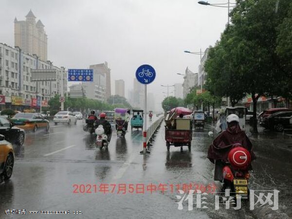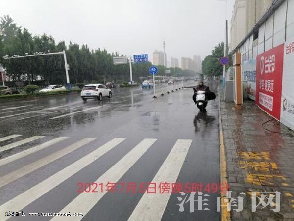 中午11時36分,天空突然下起了大雨,此時正是下班的高峰時期,朝陽中路與淮舜路交叉口也聚集了大批下班人群。在由東向西的西側車道上淮河早報、淮南網記者看到,交警部門用隔離護欄將機動車道與非機動車道分開,并在護欄上安裝了非機動車道的標識,可仍有不少非機動車主非要駛入機動車道,與機動車搶道。在一個小時的蹲守中,淮河早報、淮南網記者發現,每當紅燈轉為綠燈后,西北角的這處標識牌就成了非機動車的分界線,大部分非機動車按照規定駛進了非機動車道,安全行駛;而小部分非機動車我行我素,仍在機動車道上暢行。