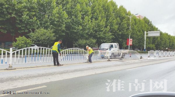 (記者 李嚴)7月17日上午,兩名工人正在國慶中路維修破損的交通護欄。