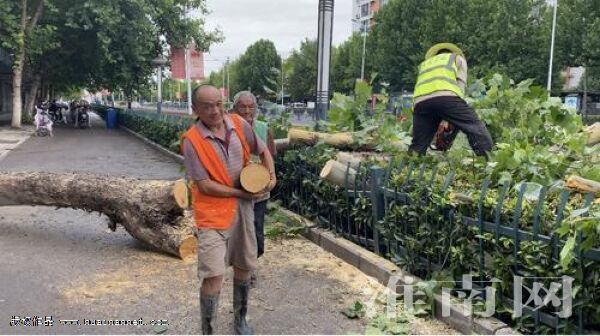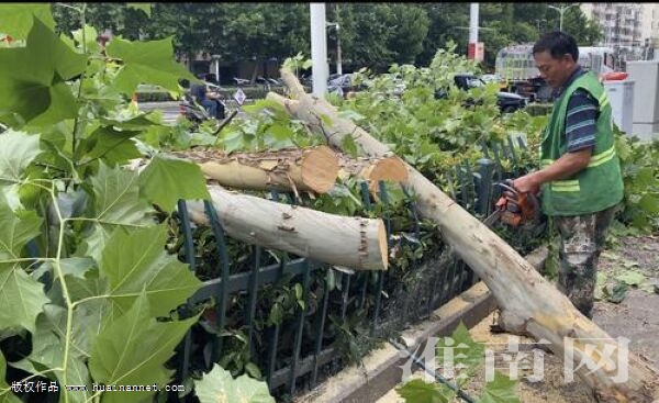 7月17日早上7時許,淮河早報、淮南網記者在現(xiàn)場看到,這棵大樹倒伏在人行道和馬路上,馬路上的樹干已經運走,還留下一些樹葉和樹枝,人行道上還有一兩米帶樹根的部分,來往的行人和電動車路過此地都要繞行,工人們正在用電鋸將多余的樹干鋸掉,然后搬運到旁邊的皮卡車上。