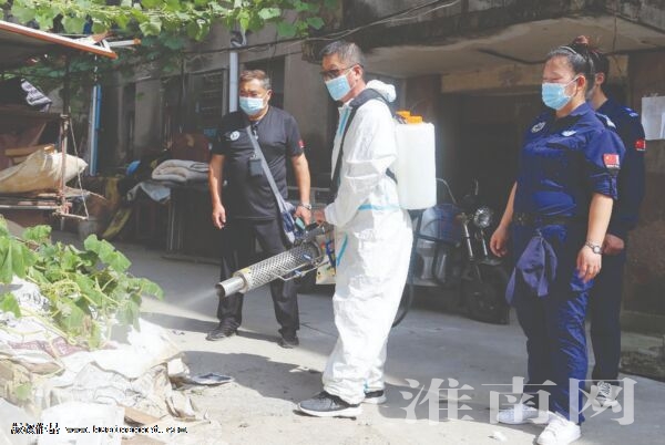 圖:淮南曙光救援隊志愿者頂著高溫在居民社區(qū)義務進行消殺作業(yè)