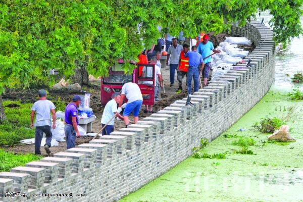 7月26日,壽縣壽春鎮(zhèn)組織民兵突擊隊(duì)、防汛應(yīng)急工作組對(duì)古城北門外景觀墻進(jìn)行加固防護(hù),全力做好防汛防臺(tái)風(fēng)工作。(通訊員 張紅梅 記者 倪軍)