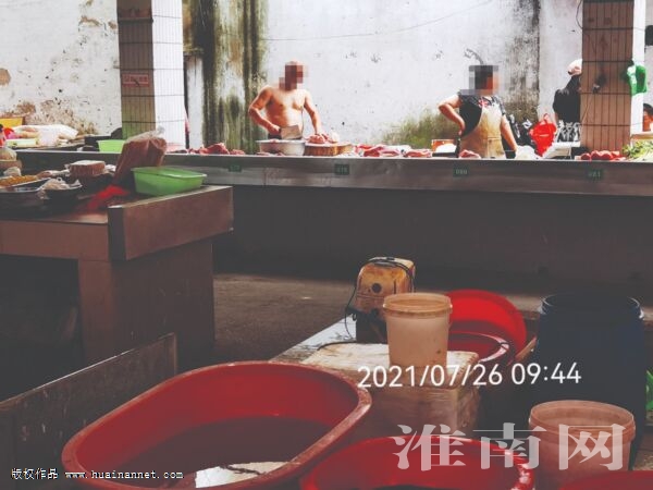 7月26日上午,天氣時陰時晴,雖然最高溫度在30度左右,但感覺不是很熱。上午9時43分,淮河早報、淮南網記者在土壩孜菜市場內看到,市場內人員往來不斷,在一肉攤處,有一光頭男子袒胸露腹,光著上半身在剁肉。大約半個多小時,一直到淮河早報、淮南網記者離開菜市場,該男子仍光著上半身。