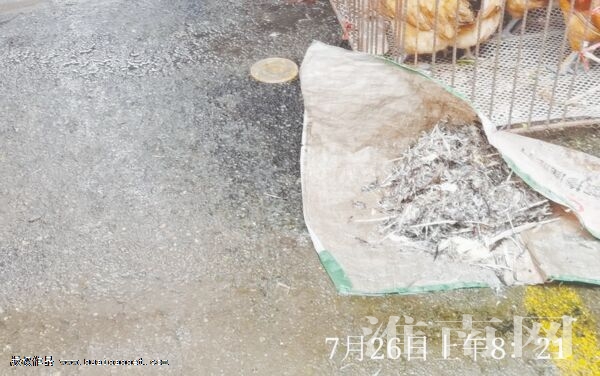 古鎮菜市場內區域劃分明確,活禽放在菜市場東邊售賣,避免了和其它區域混雜經營,如此安排是合理的,可淮河早報、淮南網記者在采訪時卻發現,售賣活禽的區域地面十分潮濕,根據地面發綠的程度,應該長期積水造成的。而鋪在地面的編織袋上滿是拔下的雞毛,這些雞毛沒有裝袋就裸露在外。