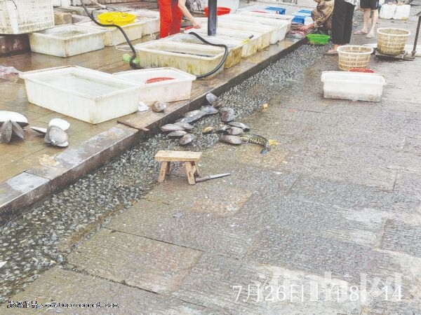 菜市場的水產區域在小街西邊,這里有好幾家賣水產的門店。當天上午,淮河早報、淮南網記者一路走來看到,這些店家把裝有水產的盆放在店門口,一些死魚、河蚌則直接放在地上。當有居民挑選到合適的水產,老板當即沿街宰殺,血水、魚鱗弄得哪都是。沿街有一條五六十厘米寬的窄道,因為長時間被水浸泡已變成了深綠色。淮河早報、淮南網記者采訪過程中,看到一運輸水產的車輛直接將水傾倒在地上,瞬間讓干凈的路面變得濕漉漉的。