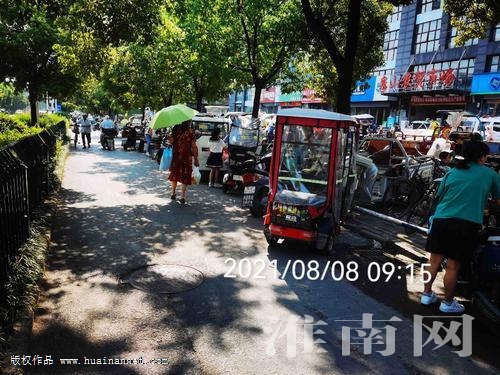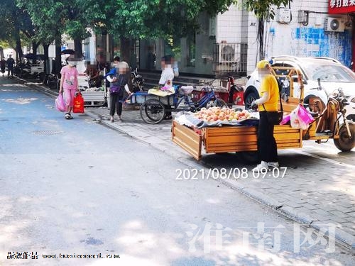 8日上午9時06分,在舜耕西路南側,靠近泉山北路公交站的人行道邊上,一連有3個攤點在此賣水果或者蔬菜。他們以車為攤,將貨品擺放在三輪車、自行車或電動車上售賣。9時20分,淮河早報、淮南網記者沿著舜耕西路南側往東,在泉山農貿市場東側,同樣看到,有兩個攤點在路邊擺攤經營。