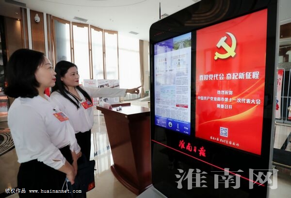 9月25日,出席市第十一次黨代會(huì)的代表們赴會(huì)報(bào)到。圖為在各駐地賓館,代表和工作人員們饒有興致地觀看淮南日?qǐng)?bào)社電子閱報(bào)屏、融媒體矩陣宣傳板牌。(記者 張?jiān)?攝)