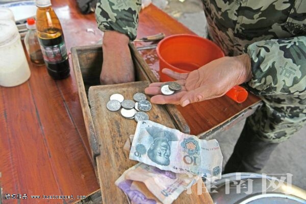 ▲12月19日,安徽省淮南市壽縣安豐塘鎮蘇王街道胡多平老人清理錢箱,3元一碗餃子,收到的多是硬幣。