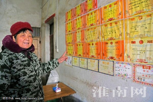 ▲12月19日,安徽省淮南市壽縣安豐塘鎮蘇王街道胡多平老人介紹餃子店墻上孫女、孫子學習獎狀,孩子們學習好是她最開心的事情。