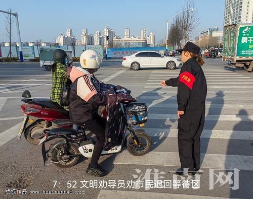 淮河早報、淮南網記者在這里看到,路口有幾名文明勸導員在值守,他們時刻注意觀察路面情況,遇到個別不遵守交通規則的市民,便立刻上前勸導。“您好,不要將車停在斑馬線上,請退到等待區等待紅燈。”7時38分,兩名騎著電動車的中年男性由南向北通過路口,等待紅燈時把車停在了斑馬線上,擋住了東西方向的行人和非機動車輛通過,文明勸導員立刻上前進行勸說,對方自覺地退回到等待區。