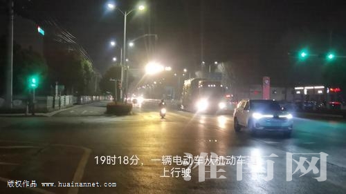 在當天的18:30—19:30,淮河早報、淮南網記者看到,該路口燈火通明,行人車輛來來往往,但路口交通仍較有序。19時12分,此時南北方向紅燈亮起,兩名騎電動車的市民自覺停在非機動車待行區等待,等綠燈亮起后才通過。