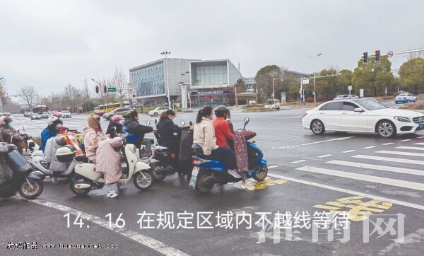 8時(shí)25分,五六輛準(zhǔn)備通過馬路的電動(dòng)車整齊地停在“禁止越線”的黃線標(biāo)志后等待,沒有一輛車超過黃線,等到綠燈亮起時(shí),電動(dòng)車齊刷刷地從非機(jī)動(dòng)車輛通行區(qū)通過。