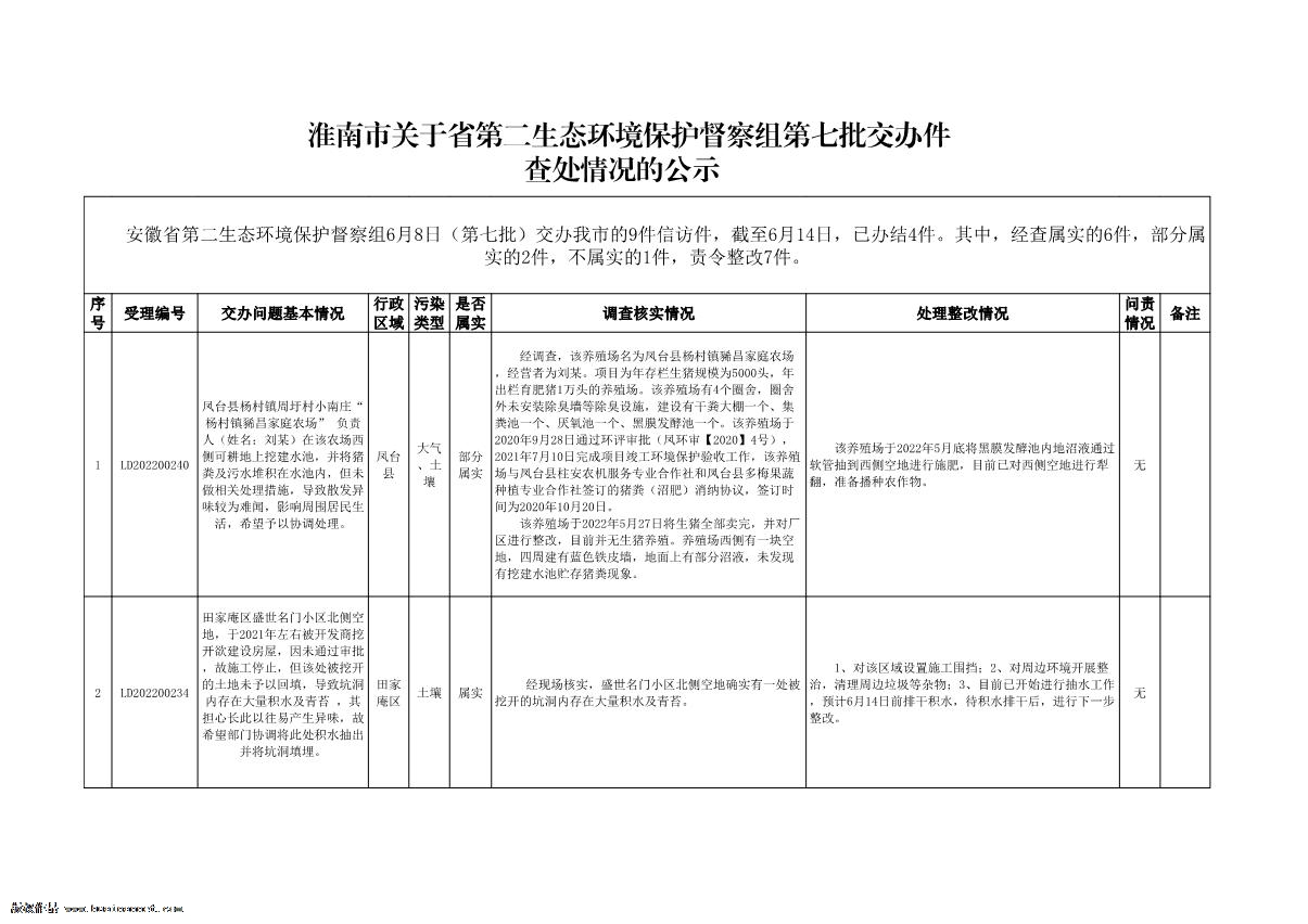 淮南市關于省第二生態環境保護督察組第七批交辦件查處情況的公示