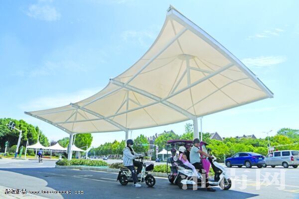市民在山南新區(qū)淮河大道交通路口新安裝的遮陽(雨)棚下等待紅綠燈過馬路。我市在“我為群眾辦實(shí)事”工作中,本著“統(tǒng)籌規(guī)劃、因地制宜、按需建設(shè)”的原則,結(jié)合群眾生活和交通實(shí)際需求,在城區(qū)人流量較大的交通路口非機(jī)動車道和行人等候區(qū)安裝遮陽(雨)棚,為等紅燈的非機(jī)動車駕駛?cè)撕托腥苏陉枔跤辍D壳?首批規(guī)劃的7個路口25處遮陽棚已經(jīng)建成投入使用。(記者 陳彬 攝)