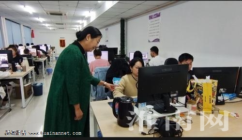 圖為曹鳳英巡查并指導員工業務工作。(記者 柏雪 攝影報道)