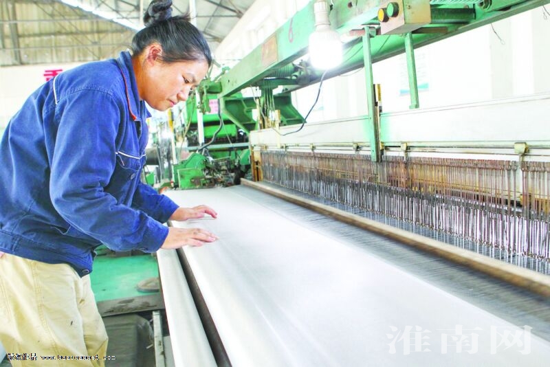 圖為安徽東浙盛科技公司工人在2800MM大寬幅滌綸長絲風筒基布織布機前察看成品質量。 (記者 陳海濤 攝)