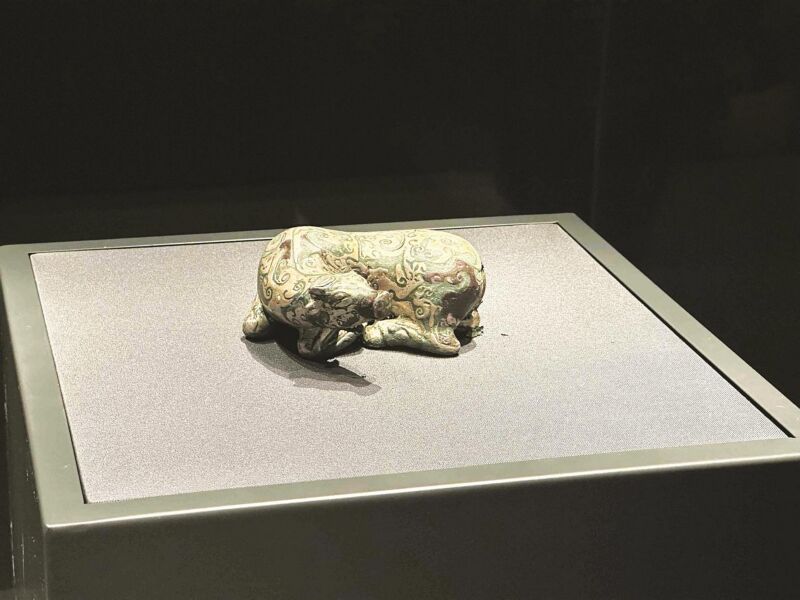 牛在中國古代的地位非常重要,不僅在農業生產中發揮著關鍵作用,同時,還是財富和地位的象征。因此,在古代的青銅器、玉器、陶器等藝術品中,常常可以看到牛的形象。在安徽楚文化博物館內,有一件小巧玲瓏的臥牛青銅鎮,這件物品因它的腹下刻有銘文“大府之器”而得名,故又被稱為大府銅牛。
