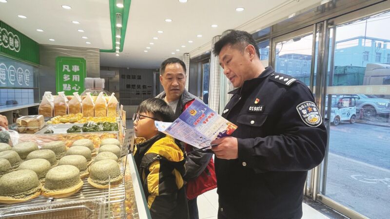 跟著民警們的腳步,記者又走進一家蛋糕店,店內彌漫著香甜的氣息,櫥柜里擺滿了各式各樣精美的蛋糕。此時,幾位頭戴防塵帽的女店員們正忙碌著顧客包裝著糕點,家長在排隊付賬,拿到糕點的孩子滿臉笑容。在這里,民警們不僅送上宣傳單,還詳細跟店內人員和顧客介紹了一些常見的詐騙手段和防范方法。聽到民警們的介紹,在旁邊選購糕點的一位年輕媽媽也抱著孩子走了過來,好奇地詢問關于網絡購物詐騙的問題,民警耐心地解答著。“不管遇到什么問題呢,記得不要隨便點擊鏈接、不要隨便轉賬,有事就直接聯系我們派出所!”周圍的顧客也紛紛圍過來傾聽,不時點頭表示認同。面對他們提出的疑問,現場,民警們也都一一耐心解答。