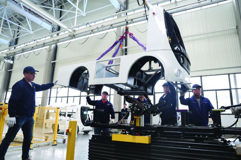 日前,在開沃汽車(淮南)有限公司,工人正在無人物流車臨時裝配線上作業,開發系列無人物流車產品。目前,沖壓車間、焊裝車間、模組PACK車間、測試跑道等多個主體工程建設完工,涂裝車間正在加班加點施工,建成后將形成年產5萬臺輕型商用車的能力。