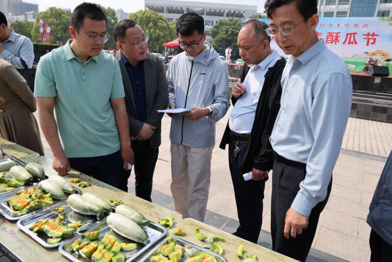 當天,潘集區(qū)政府廣場熱鬧非凡。一排長條桌上,30盤標著號碼的酥瓜整齊陳列,清亮飽滿的瓜皮覆著細密絨毛,清甜香氣在空氣中肆意流淌。潘集區(qū)蔬菜辦負責人蘇亞與工作人員忙著削皮切瓜,香甜四溢的酥瓜讓他們臉上笑開了花。