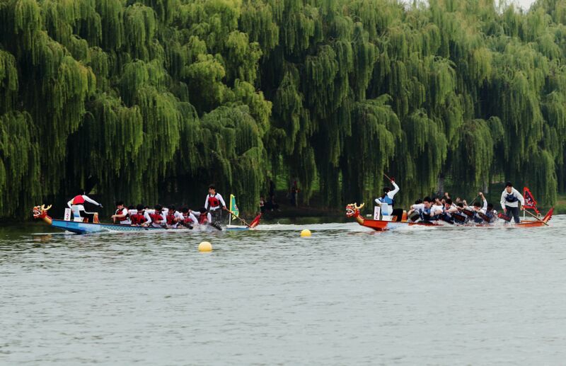 5月31日是傳統節日端午節。在壽縣古城通淝門護城河,第二屆“安豐塘杯”龍舟大賽激情開槳。來自壽縣各鄉鎮的21支龍舟隊進行了激烈較量,最終八公山鄉龍舟隊、張李鄉龍舟隊、陶店鄉龍舟隊奪得前三名。圖為比賽場景。