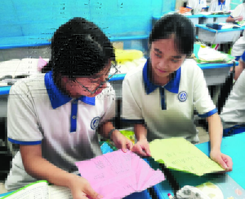 活動(dòng)現(xiàn)場(chǎng),孩子們?cè)诶蠋煹闹笇?dǎo)下齊聲唱起《少年的你啊》等充滿青春活力的歌曲,清脆的童聲在教室里回蕩。他們手拉著手,稚嫩的臉龐上洋溢著燦爛的笑容,隨著音樂節(jié)奏輕輕搖擺。一曲結(jié)束,小朋友們齊聲祝福哥哥、姐姐旗開得勝,為即將奔赴考場(chǎng)的學(xué)子們注入溫暖的力量。孩子們將寫滿祝福的紙飛機(jī)奮力擲向天空:“希望哥哥姐姐像紙飛機(jī)一樣飛得高高的!”收到祝福的初三學(xué)生連欣怡驚喜地說:“沒想到會(huì)被幼兒園的小朋友‘點(diǎn)名’加油,瞬間覺得壓力變成了動(dòng)力!”哥哥姐姐們被這份純真的祝福深深打動(dòng),紛紛回贈(zèng)給小朋友們精心準(zhǔn)備的小禮物,有彩色手環(huán)、卡通貼紙和蘋果,現(xiàn)場(chǎng)頓時(shí)變成了一片歡樂的海洋。大孩子和小孩子們相視而笑,這場(chǎng)跨越年齡的暖心互動(dòng),讓每個(gè)人都感受到了愛與鼓勵(lì)的力量。