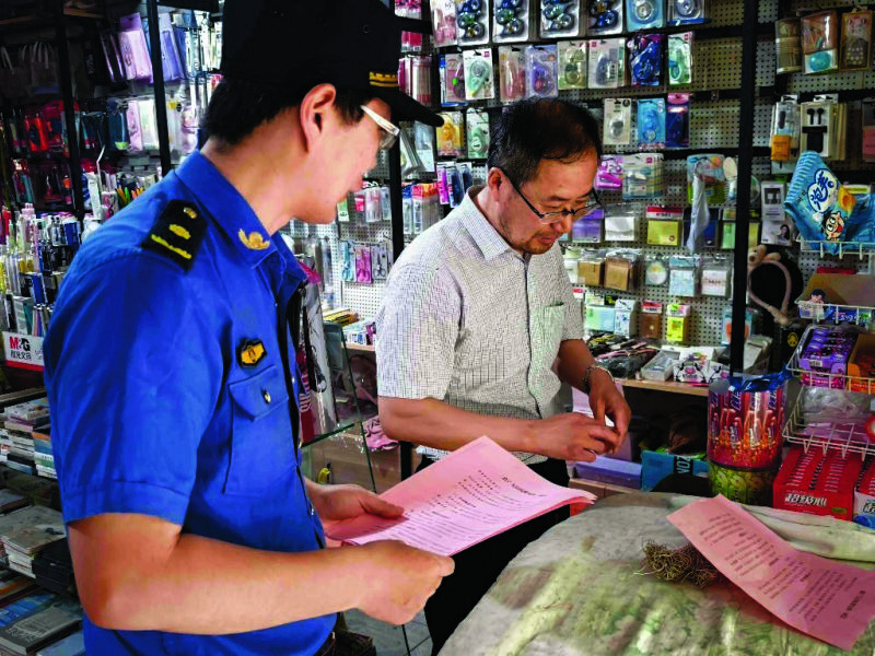 城管工作人員向商戶發放告知書