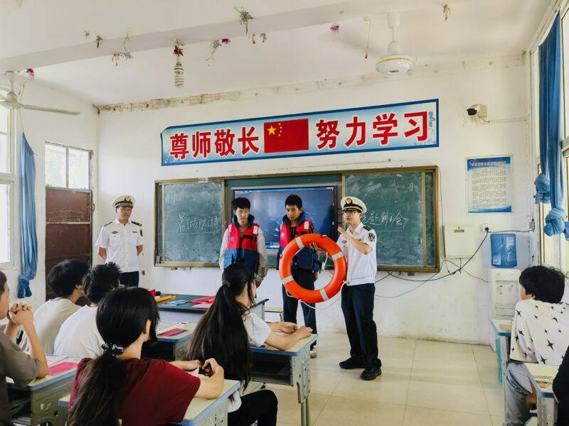 活動中,海事人員借助多媒體播放防溺水警示視頻,一幕幕觸目驚心的畫面迅速吸引了學生的注意。隨后,海事人員宣讀了《安全倡議書》,并發放《水上交通安全常識宣傳冊》《防溺水小常識》等資料。結合宣傳資料,海事人員多角度深入講解防溺水知識,詳細闡述“如何防溺水”及“怎樣救助溺水者”,著重強調“防溺水六不準”,同時普及常見救生設備知識,現場演示了救生衣、救生圈的正確穿戴和使用方法。