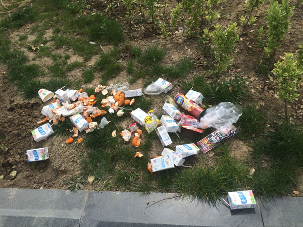 圖四:成堆的牛奶盒留在草地上市民將寵物狗帶進園區(qū)