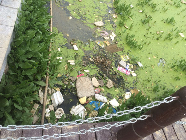 園區(qū)內(nèi)的草坪遭到人為破壞,游人隨手拋棄的垃圾成堆,一些垂釣者也留下不文明行為,周末還有人在此擺攤設(shè)點