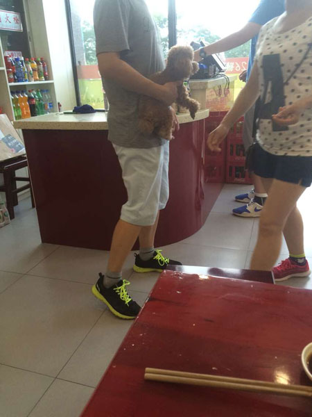 7月11日下午,淮河早報、淮南網記者在山南某快餐店內看到,一名市民抱著心愛的寵物狗與家人進店就餐。就餐期間,該市民一直抱著小狗坐在餐桌旁,一邊吃飯,一邊不時地用手撫摸著狗狗,有時還用手給狗狗喂食。因該市民是在大廳就餐,其旁邊還坐了不少前來就餐的市民,其行為讓很多市民大倒胃口。而在其他一些小飯店,淮河早報、淮南網記者也看到這種人狗同桌而食的現象。市民李先生在采訪中就告訴淮河早報、淮南網記者:“現在家里養寵物狗的市民非常多,出門帶狗的現象也非常普遍。尤其是在一些飯店里,家人、朋友聚餐時,許多人就把寵物狗抱在懷里,或是安放在座位上,儼然當成了家庭的一份子。而現在飯店的生意也都不好做,許多飯店對于帶狗進店用餐的行為也就睜一只眼、閉一只眼了!崩钕壬f,要是在包間內還好些,畢竟不會影響其他市民就餐?捎幸恍┦忻裨诖髲d內也抱著狗親熱,用摸過狗的手去拿碗筷,甚至讓狗坐在桌子上,和他們一起用餐,這讓許多市民厭惡的同時,還覺得很惡心。