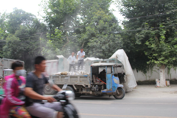 圖二:兩名裝卸工人把水泥從大貨車(chē)上卸載到三輪車(chē)上,水泥揚(yáng)塵讓路人無(wú)處可避