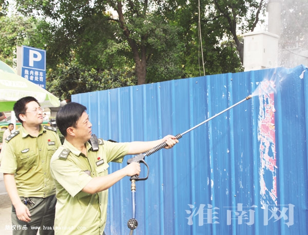 我市城管部門將加強城市管理作為創建文明城市的重要保障,按照精細化、網格化管理要求,嚴格落實工作責任,分線作戰、分片包保,大力開展市容治理攻堅行動,著力營造干凈、整潔、文明、有序的城市環境。圖一為噴霧壓塵車在路面灑水除塵。圖二為城管工作人員清除街頭非法小廣告。