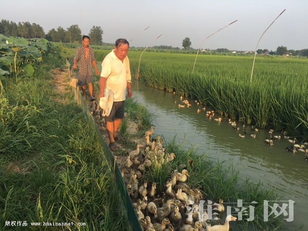 當天,在李光兆帶領下,淮河早報、淮南網記者來到了他承包的稻田旁,只見大片大片綠油油的稻田被一圈水系隔在中間,許多小鴨子在水里游著,稻田旁則搭建了一處大概幾十平方米的棚子,陳士貴和趙守連正在棚子里給鴨子喂食、喂水,兩人在這里已經干了一個多月了。每天早上六七點鐘,兩人來到鴨棚喂養鴨子,中午輪流回去吃飯,然后一直待到傍晚才結束一天的工作。雖然天氣炎熱,兩人卻不覺得辛苦,他們告訴淮河早報、淮南網記者,現在每個月能有1200元的收入,相對于以前沒人雇傭的日子來說,簡直是太好了。