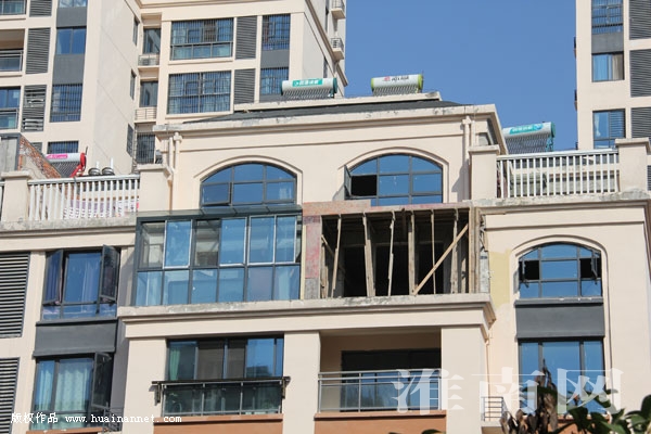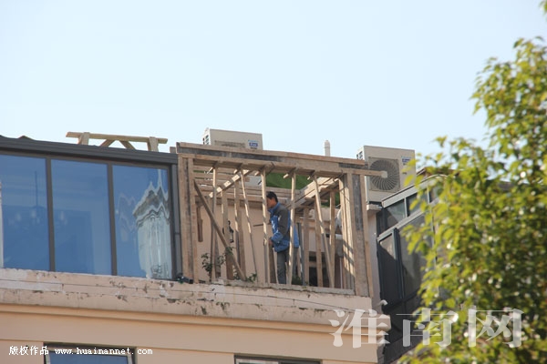 接電后,淮河早報、淮南網記者立即趕到中央美域小區。進入小區內發現,該小區入住率還不太高,但是多層樓房的頂端大都已建成了玻璃的陽光房,有的違建房使用的是混凝土澆筑。在六號樓樓頂,兩間澆筑完的混凝土框架剛拆除模板。同棟樓的另一戶正在忙著搭建混凝土模板還尚未澆筑,工人正在樓頂忙碌著。在該小區樓房頂層,像這樣使用混凝土澆筑房屋或者搭建鋁合金玻璃房的現象比比皆是。淮河早報、淮南網記者粗略數了一下,幾乎每棟樓有業主入住的頂層都加蓋起了房屋。