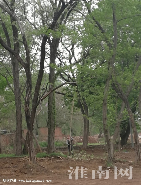 4月13日下午,淮河早報(bào)、淮南網(wǎng)記者根據(jù)市民李先生提供的線索來(lái)到園藝南路,在現(xiàn)場(chǎng),一位老年男子正在一片洋槐樹林中攀摘,該男子手持長(zhǎng)約4米的竹竿,竹竿上捆綁著鐮刀,奮力砍著樹枝,帶有洋槐花的樹枝落了一地。