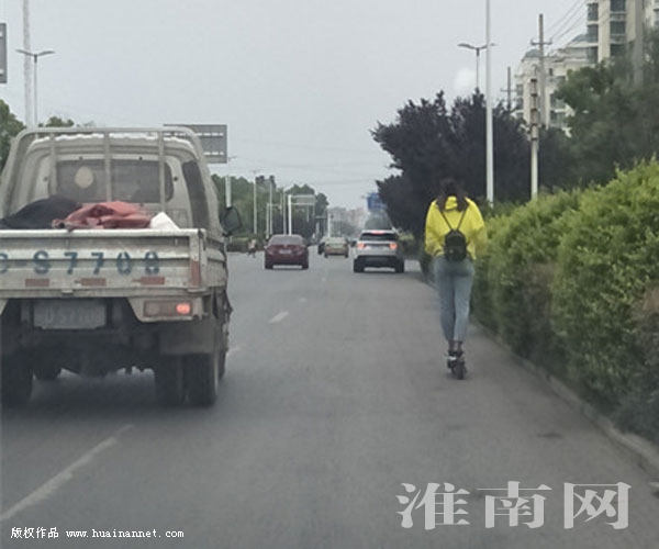 4月21日中午,田大南路由南向北方向,一輛行駛中的小貨車突然緊急剎車。隨后,從小貨車的車頭方向出現(xiàn)一位身穿黃色外套,腳踏電動滑板車的女子,只見其從路中央向東橫穿而過,在機動車道上前行。